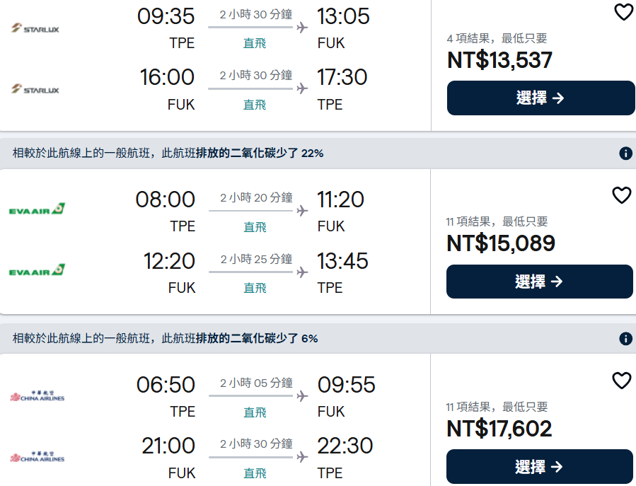 JX-840 TPE/FUK 09:35/13:05 (2 小時 30 分)