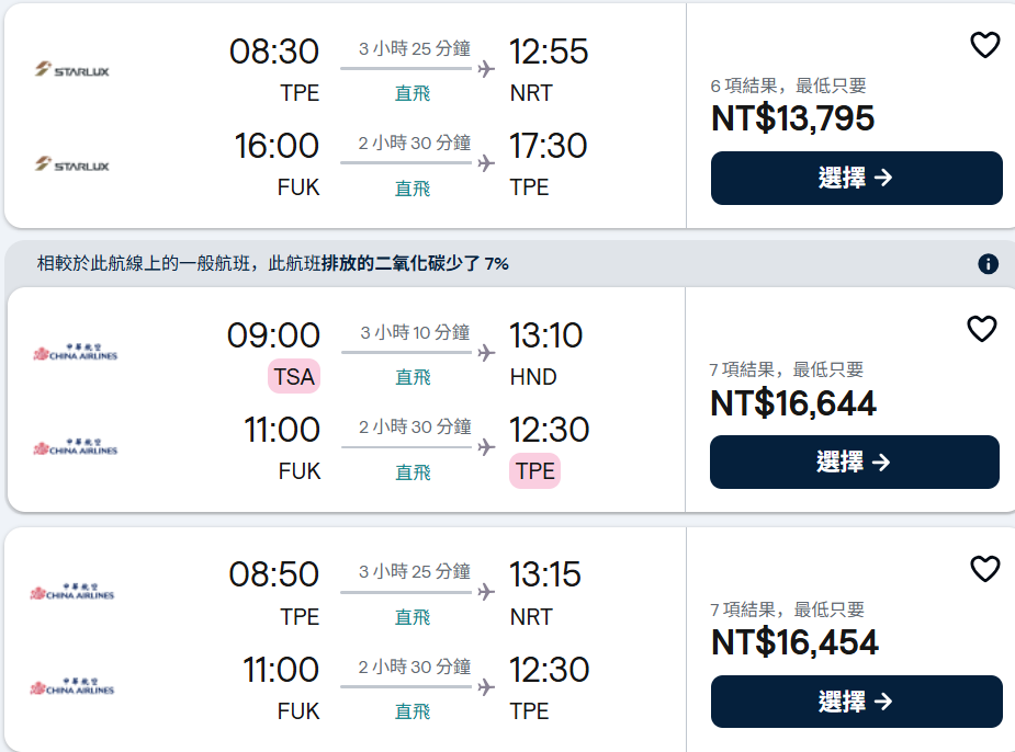 JX-840 TPE/FUK 09:35/13:05 (2 小時 30 分)