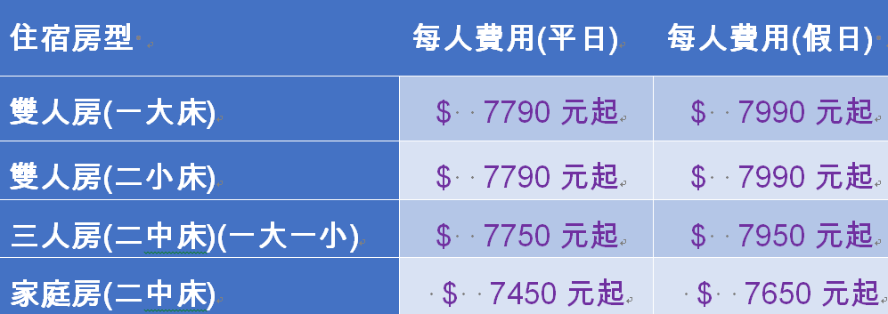 - 售價說明:每人費用說明(以新台幣計價),此報價為本國籍人士,外籍人士煩請另詢報價