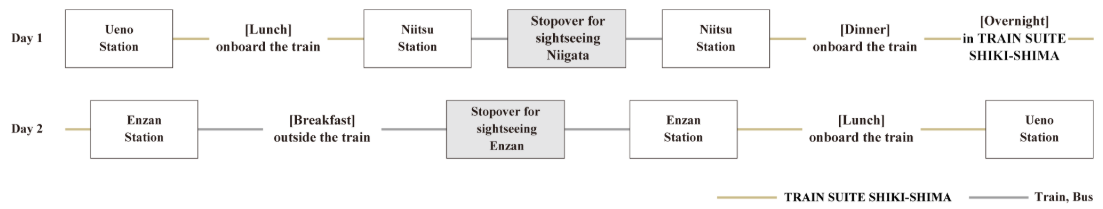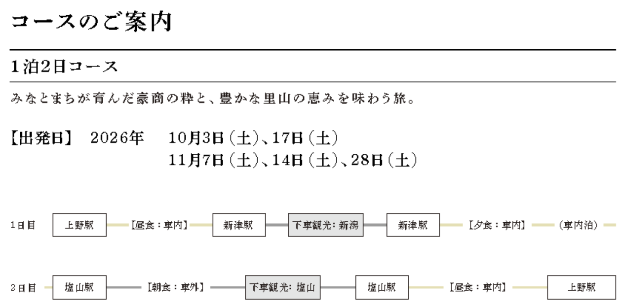 - 2 天 1 夜行程從上野站出發,途經新潟縣和山梨縣,然後返回上野。