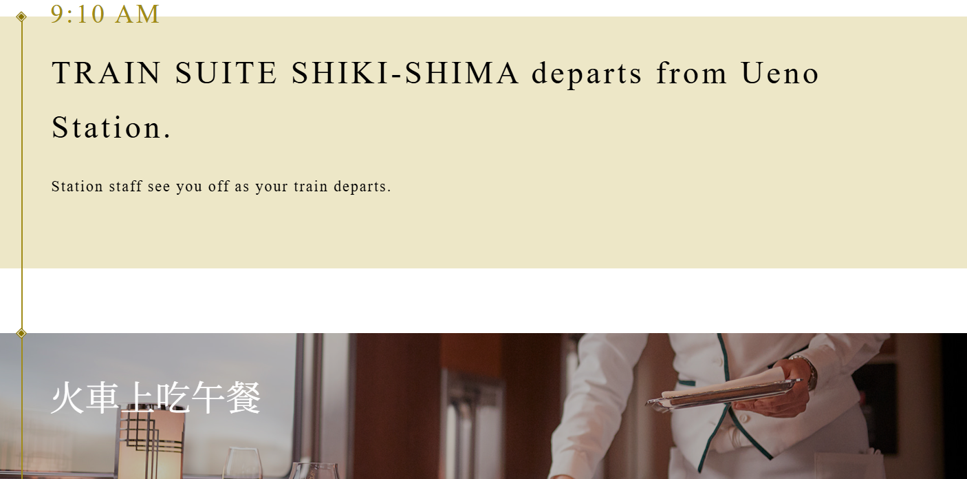 - 專屬服務: 旅客在上野車站有專屬貴賓室「PROLOGUE 四季島」辦理手續,享受私寵般的旅遊體驗。