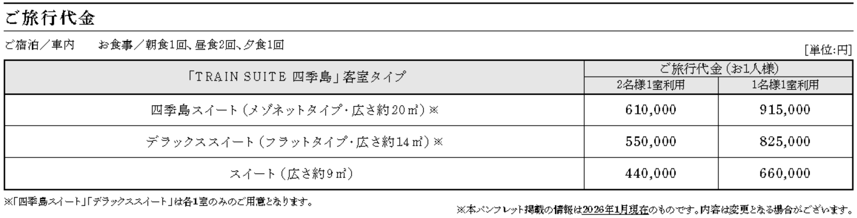 - 頂級套房: 列車僅接待 30名 貴賓,設有三種房型,其中「四季島套房」為樓中樓設計,配有榻榻米空間和檜木浴缸。