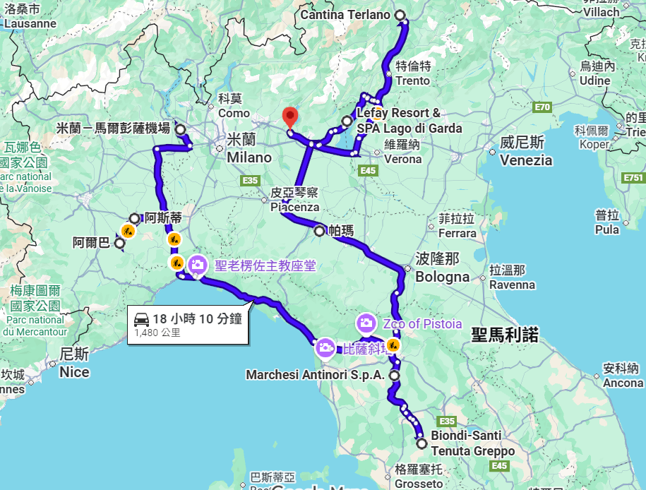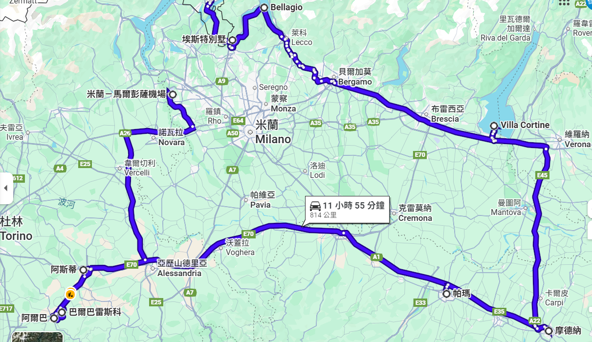帕瑪Parma →(61公里,約1小時)→ 摩德納Modena →(125公里,約1小時45分)→西米歐尼Sirmione (加達湖畔)