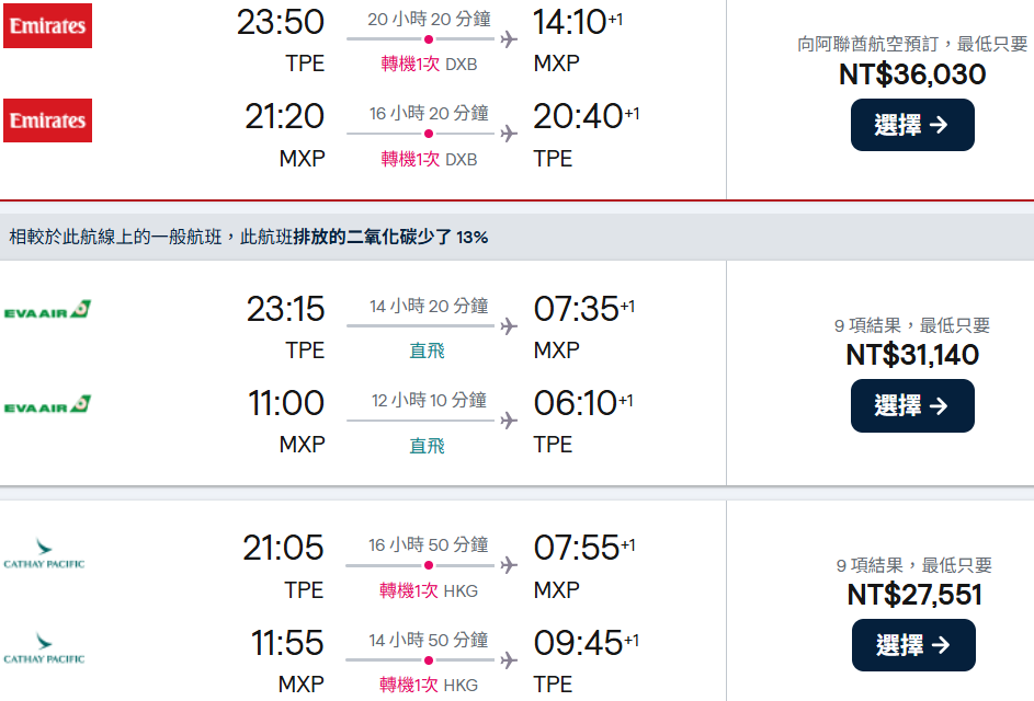 國泰航空 CX-233 HKG/MXP 00:50+1/06:45 (12小時55分)