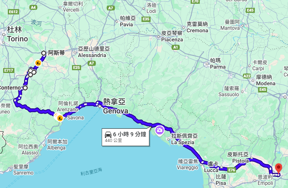 米蘭 →(151公里,約2小時)→ 阿斯蒂Asti →(29公里,約35分)→ 巴爾巴雷斯科Barbaresco→(25公里,約30分)→ 阿爾巴Alba