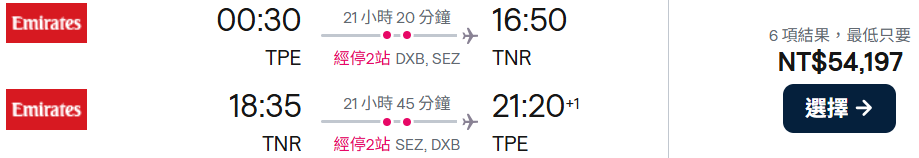 安塔那那利佛/塞席爾 EK-708 TNR/SEZ 18:35/22:20 (2小時45分) 塞席爾/杜拜 EK-708 SEZ/DXB 23:55/04:20+1 (4小時25分)